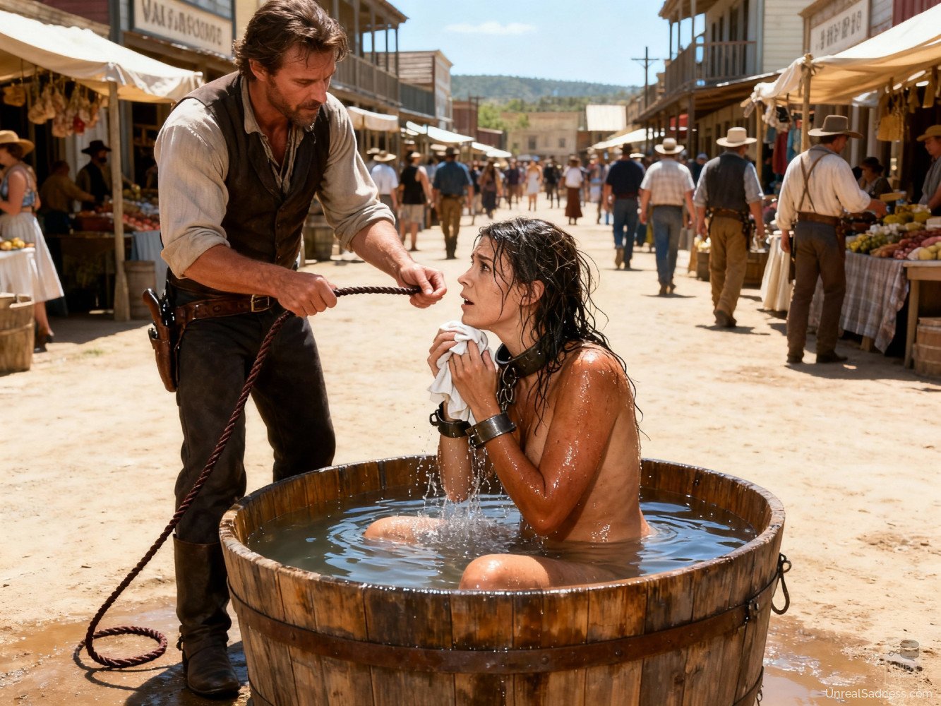 A sweaty slavegirl stands waiting on a hot western street, her posture still beneath the burning sun. Heat and dust cling to bare skin as time stretches, turning restraint into endurance. The moment captures silence, patience, and the quiet weight of being made to wait.