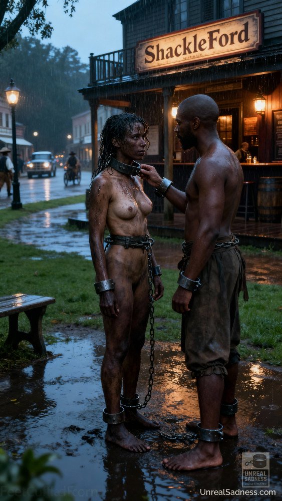 A shackled slavegirl stands on a rain-soaked street in Shackleford beside her owner, water tracing over skin and iron alike. The scene captures quiet interaction and visible hierarchy, where rain softens the atmosphere but leaves restraint unchanged.