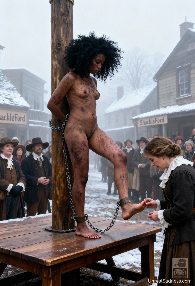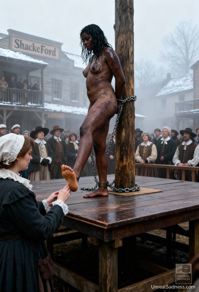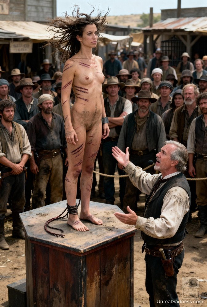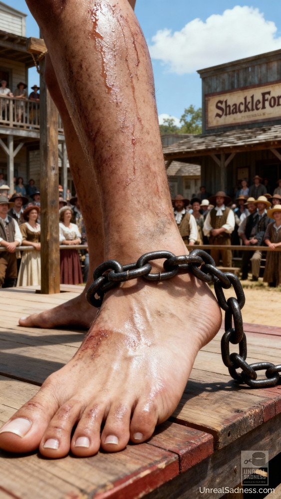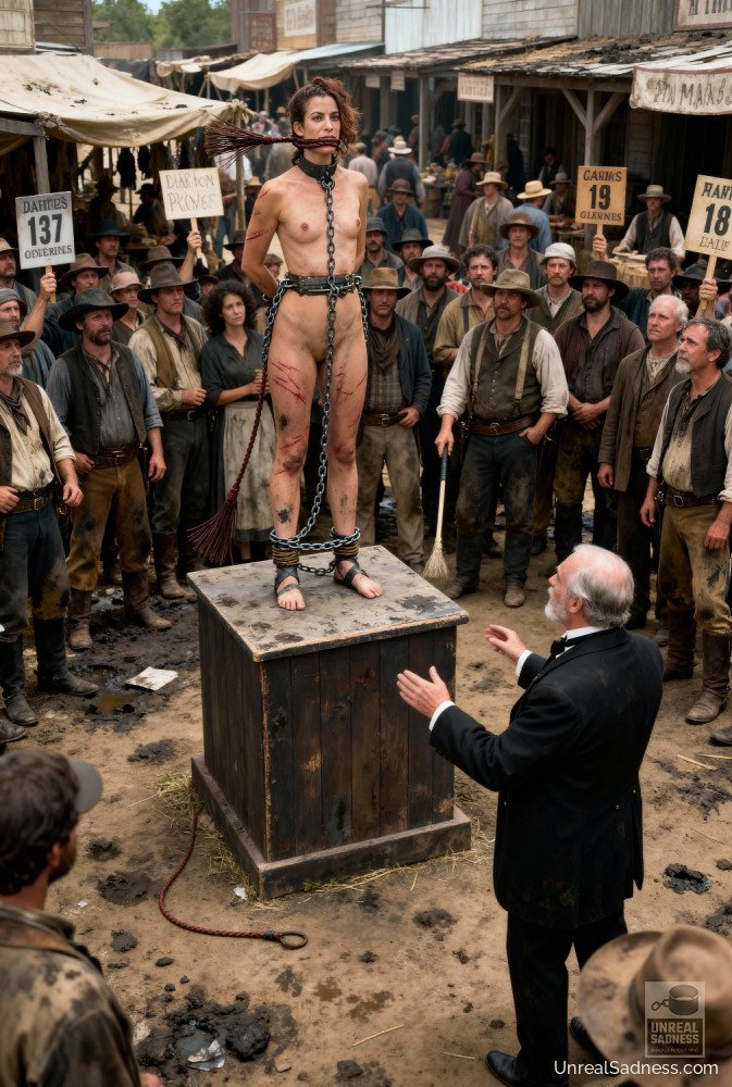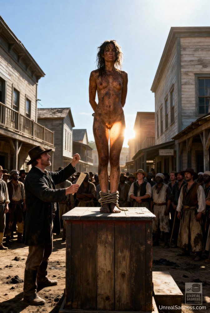 Bound to the auction post, she stands barefoot on the platform as the crowd gathers, weighing her fate in silence and whispers. Dust, heat, and watchful eyes press in from all sides while the bidders study every movement, every breath. In Shackleford, a life can change hands with a nod, a glance, a raised finger. This moment captures the fragile pause between fear, endurance, and whatever future waits beyond the final bid.