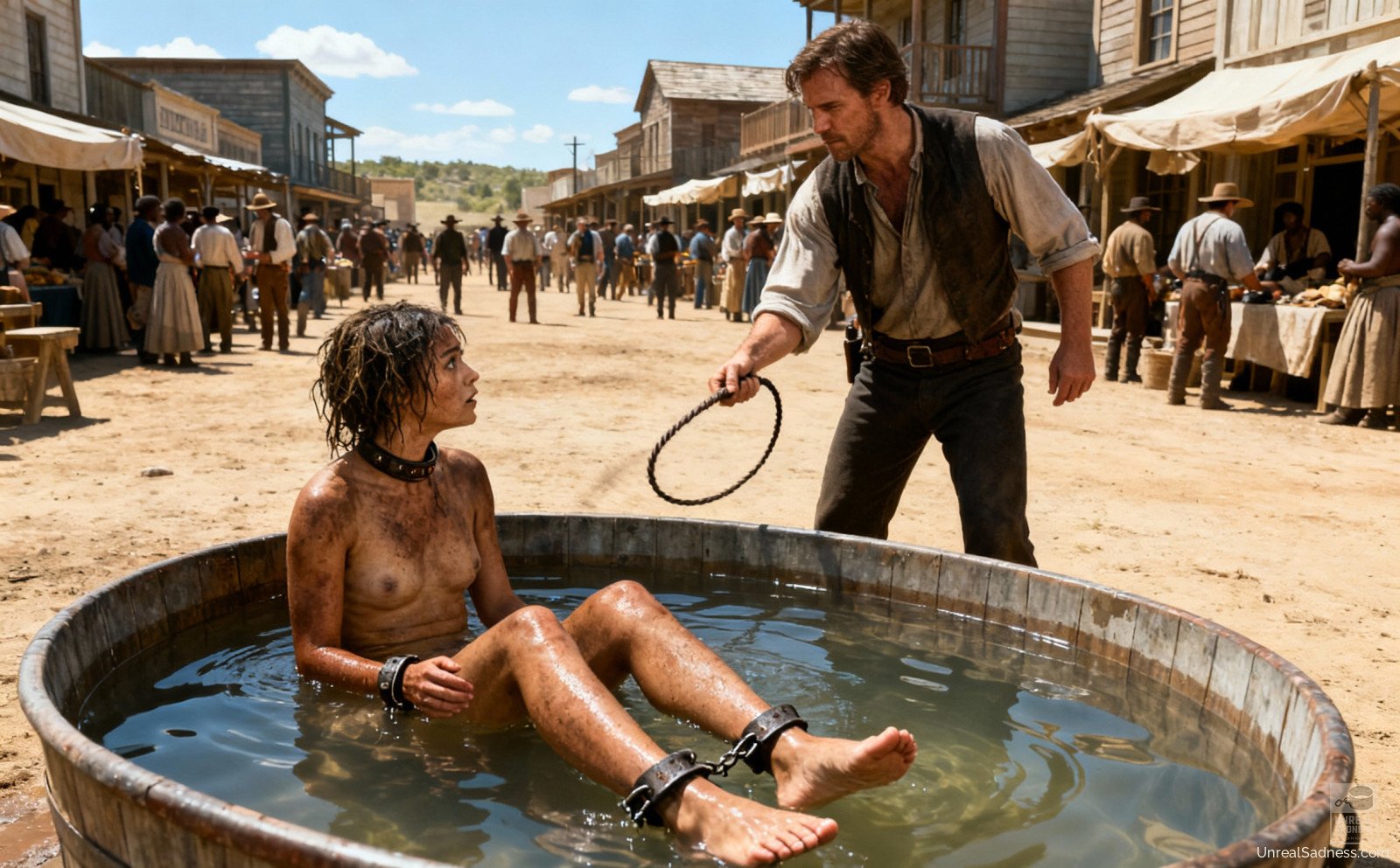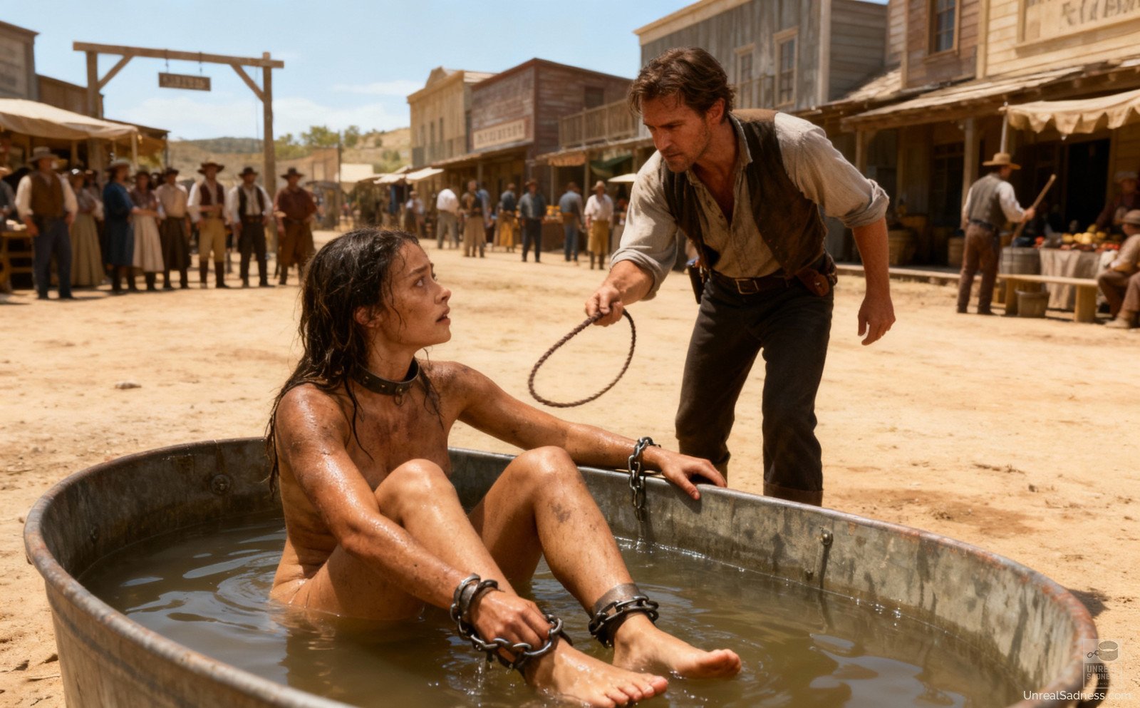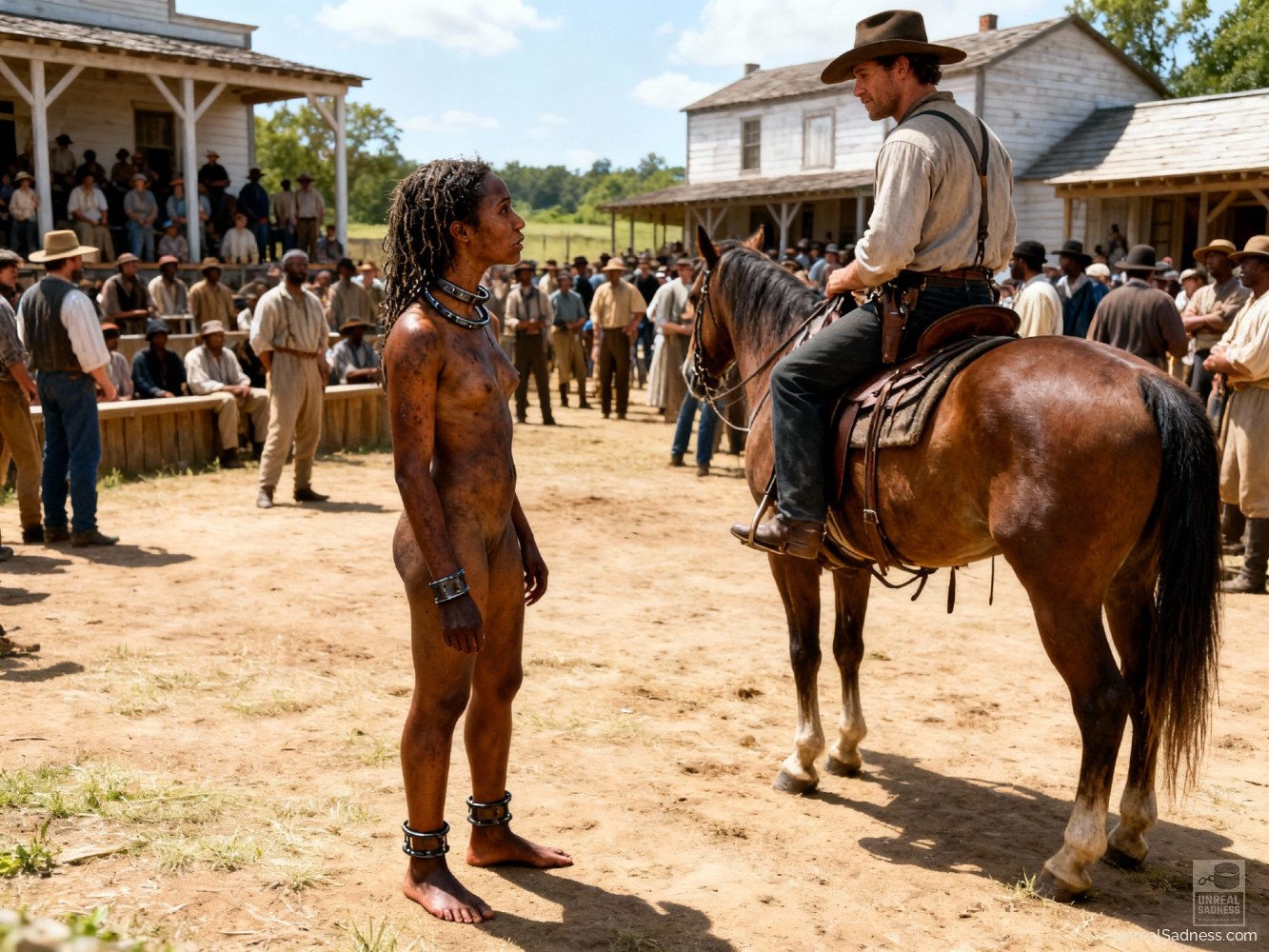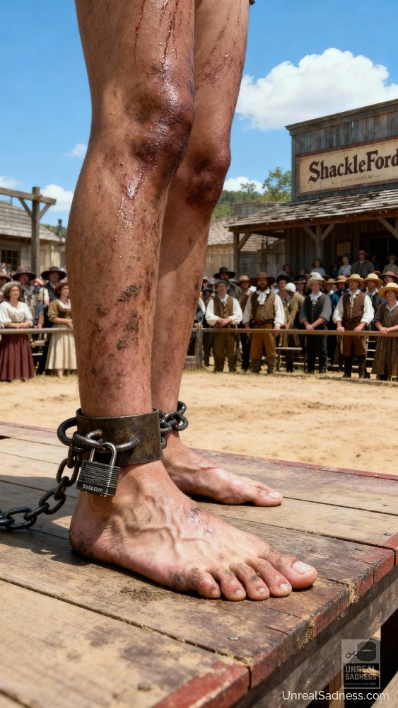 Bound to the auction post, she stands barefoot on the platform as the crowd gathers, weighing her fate in silence and whispers. Dust, heat, and watchful eyes press in from all sides while the bidders study every movement, every breath. In Shackleford, a life can change hands with a nod, a glance, a raised finger. This moment captures the fragile pause between fear, endurance, and whatever future waits beyond the final bid.