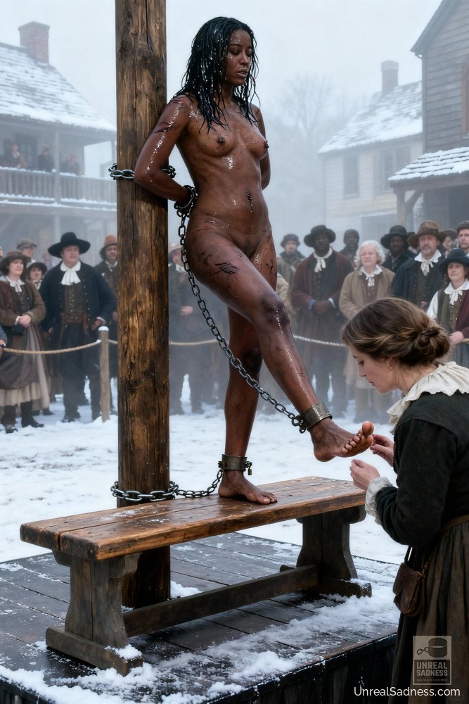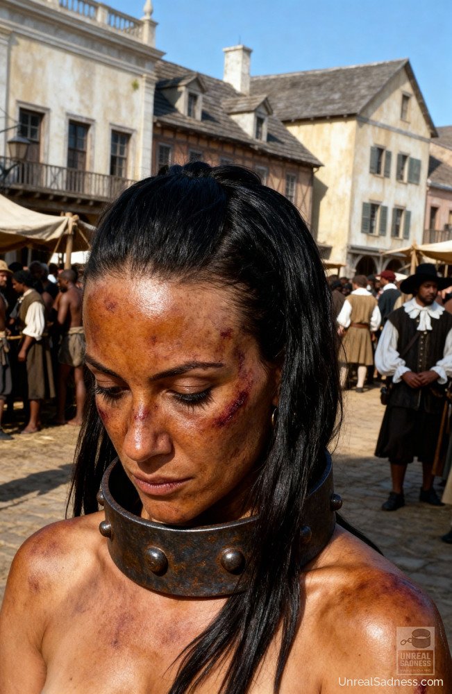 Shackles bite into her skin as strangers discuss her value aloud. She listens, powerless, as her future is debated like merchandise.