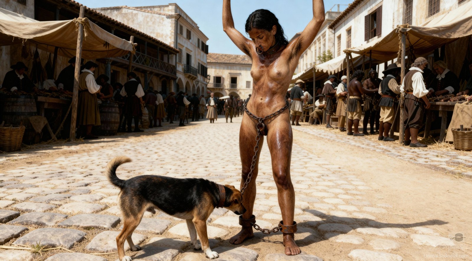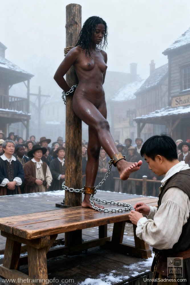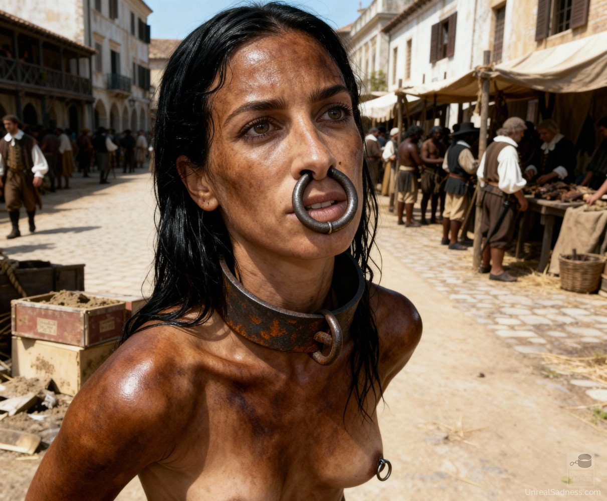 This shackled Slave Girl keeps her eyes low as the crowd watches closely. Every sound of the auction hall deepens her uncertainty and submission.