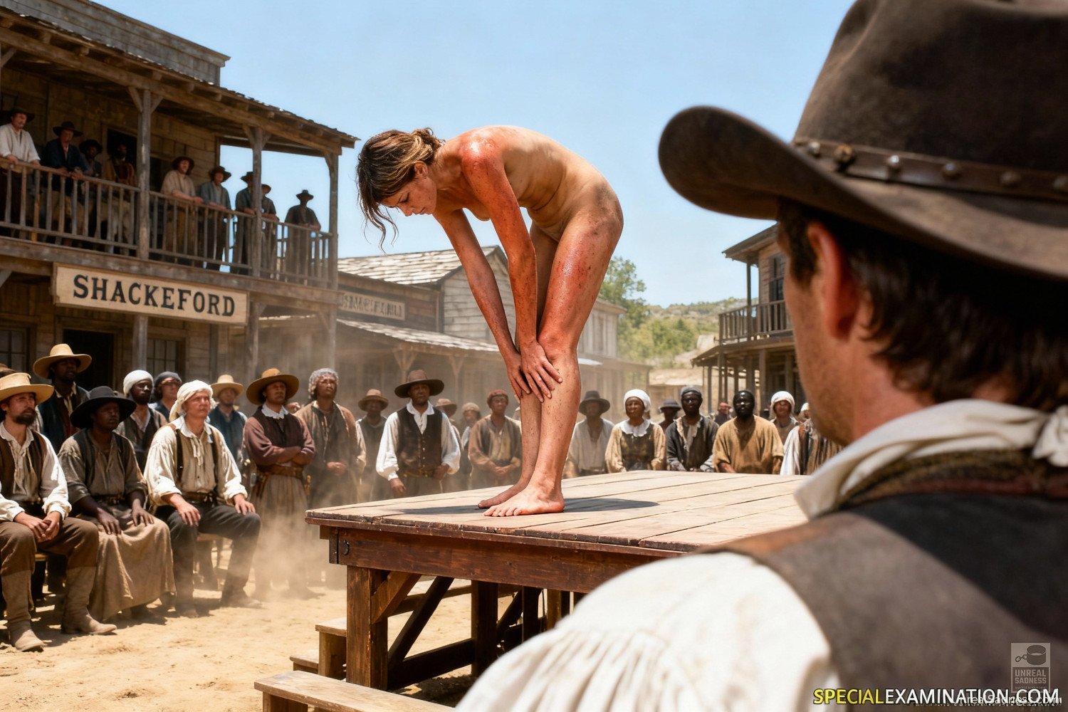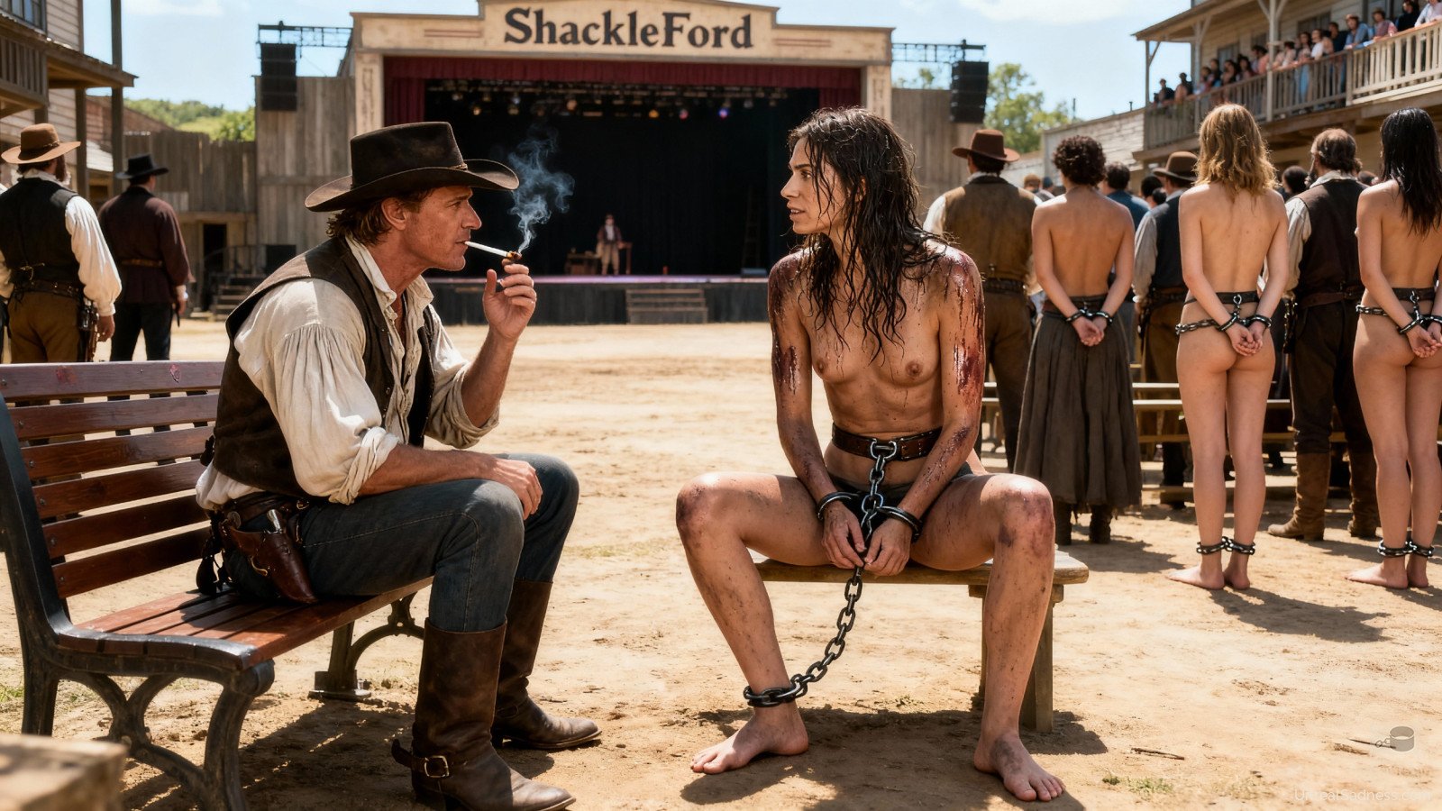 In the blistering heat of Shackleford’s main square, chained women are presented to the crowd as property, not people. The auction is public, loud, and indifferent - buyers circle slowly, judging posture, endurance, and obedience rather than faces or names. Every gaze weighs heavy, every pause stretches longer than the chains that bind them. This moment marks the end of one captivity and the terrifying uncertainty of the next.