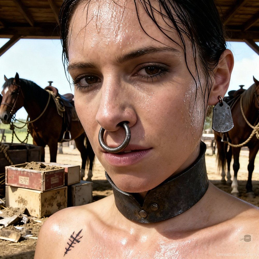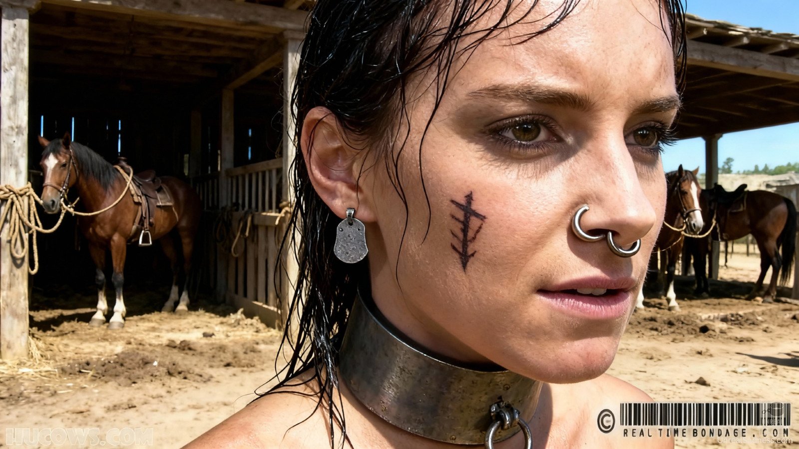 A chained woman stands motionless inside the barn, her body marked by work and heat. The air is heavy with exhaustion, routine, and quiet obedience. This scene captures submission, control, and the bleak rhythm of life inside the mare barn.