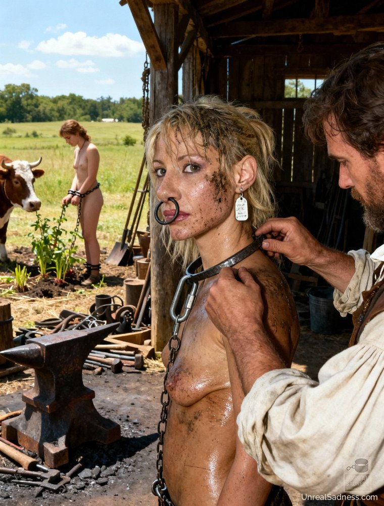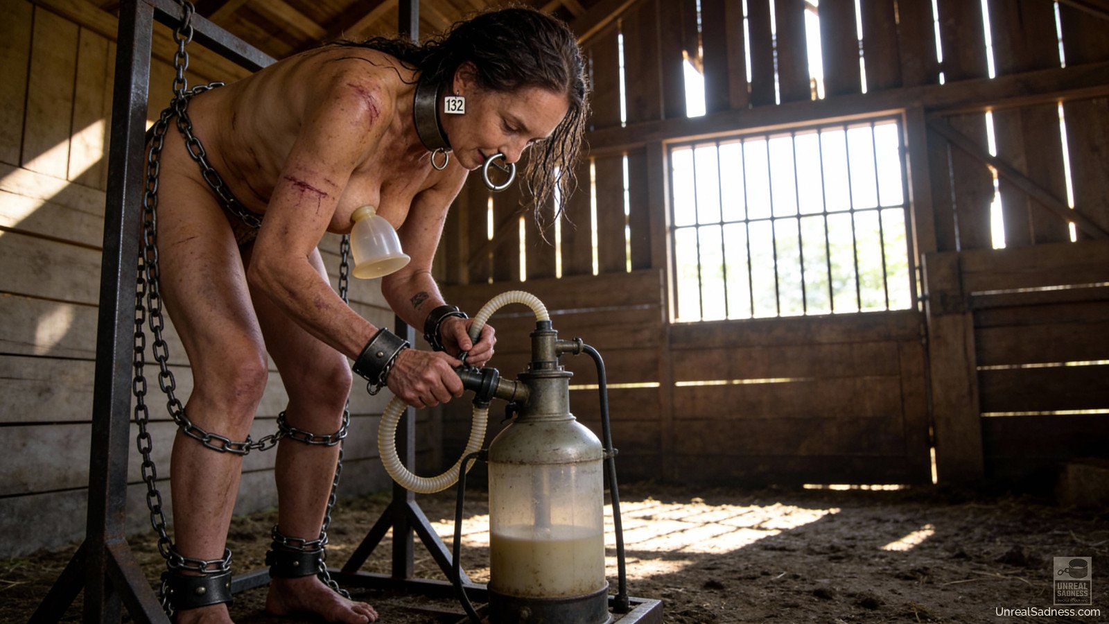 Chained beneath rough timber, she performs her assigned work without resistance. The barn watches, unmoving and indifferent.